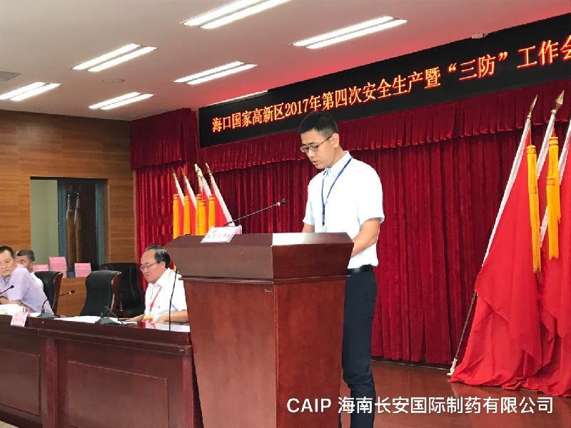 2017年10月20日,在海口國家高新區(qū)2017年第四次安全生產(chǎn)暨“三防”工作會(huì)議上,海南長安國際制藥有限公司等11家企業(yè)在第20號(hào)臺(tái)風(fēng)卡努期間,積極配合高新區(qū)管委會(huì)做好防風(fēng)防汛及臨時(shí)避險(xiǎn)點(diǎn)的安置工作,獲得優(yōu)秀企業(yè)表彰,公司有幸代表受表彰的企業(yè)之一受邀上臺(tái)發(fā)言。