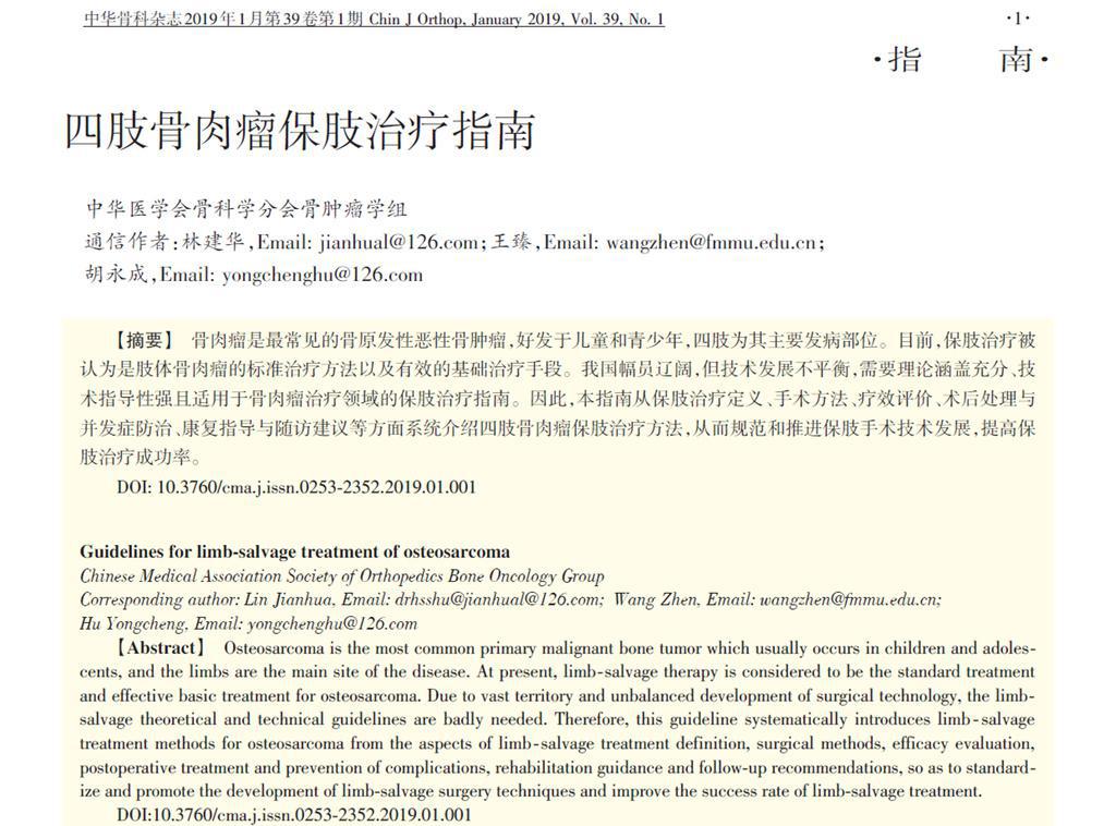 骨肉瘤是最常見的骨原發(fā)性惡性骨腫瘤,好發(fā)于兒童和青少年,四肢為其主要發(fā)病部位。目前,保肢治療被認為是肢體骨肉瘤的標準治療方法以及有效的基礎治療手段。我國幅員遼闊,但醫(yī)療技術發(fā)展不平衡,需要理論涵蓋充分、技術指導性強且適用于骨肉瘤治療領域的保肢治療指南。因此,“四肢骨肉瘤保肢治療指南”從保肢治療定義、手術方法、療效評估、術后處理與并發(fā)癥防治、康復指導與隨訪建議等方面系統(tǒng)介紹四肢骨肉瘤保肢治療方法,為規(guī)范和推進保肢手術技術發(fā)展、提高保肢治療成功率保駕護航。