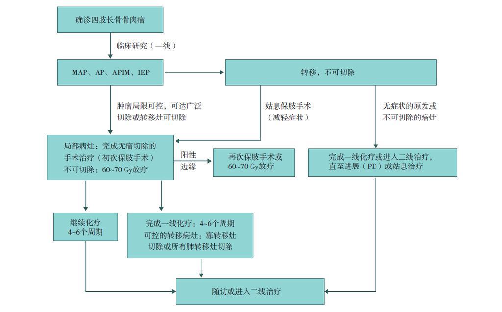保肢治療指經(jīng)典型骨肉瘤在多學科團隊醫(yī)生共同努力下完成的新輔助化療、保肢手術和輔助化療等一系列治療總稱,其目的是在提高患者生存率的前提下,減少局部復發(fā)、盡量保留良好的肢體功能。肢體經(jīng)典型骨肉瘤保肢治療方法如下圖所示: