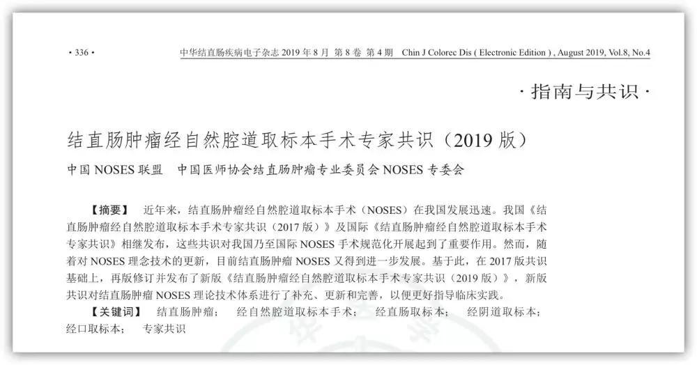 該版《共識》對NOSES 的整個理論技術體系進行了補充、更新和完善,并針對結直腸NOSES多方面問題進行闡述,進而更好地指導臨床實踐,促進NOSES手術的規范開展。